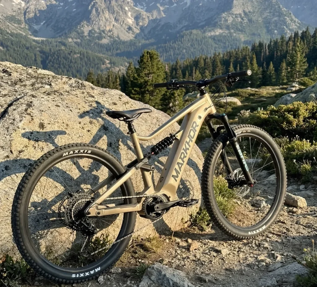 - Ruedas y Cubiertas High-End: Llantas Markhor MTB PRO de 32mm de ancho con mazas Boost y cubiertas Maxxis RECON (2.6″) anchas que ofrecen un grip inigualable en cualquier superficie.