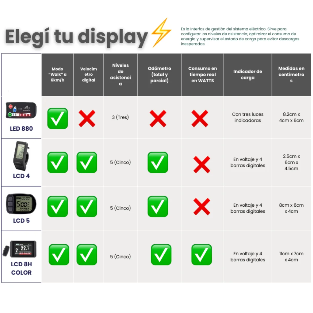 - Control Total en el Manillar: Incluye un display (pantalla) a elección para que controles tu velocidad, el nivel de asistencia y el estado de la batería en todo momento.